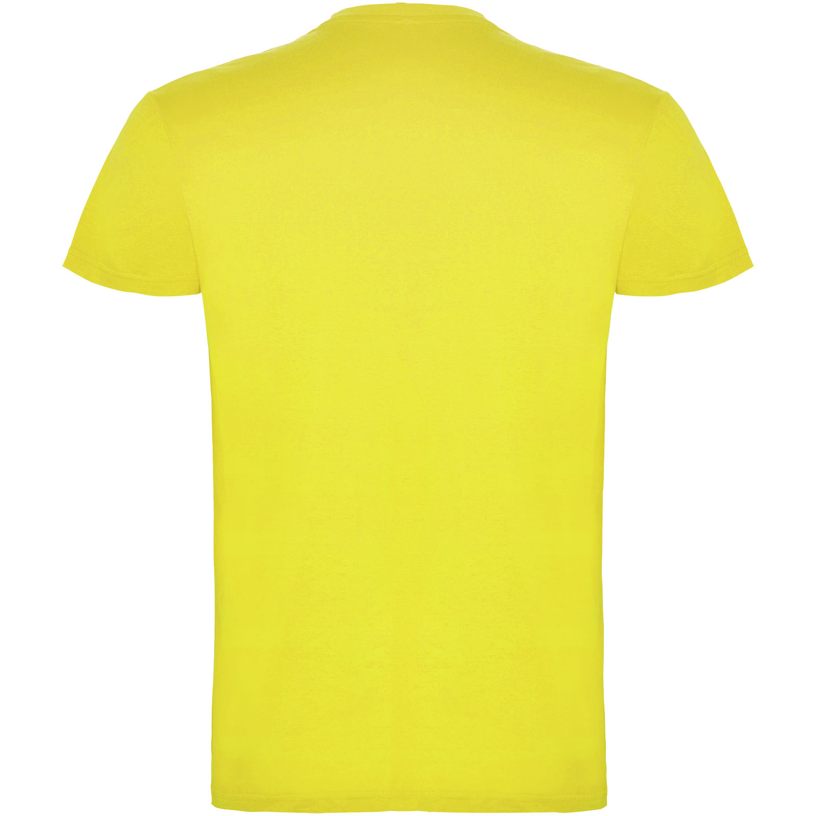 Kurzärmeliges T-Shirt mit doppellagigem Rundhalsausschnitt aus Elasthan, hergestellt aus schlauchförmigem Material für Erwachsene. Verstärkte und verdeckte Nähte am Kragen. Herausnehmbares Etikett. Das Modell ist 190 cm groß und trägt Größe L.