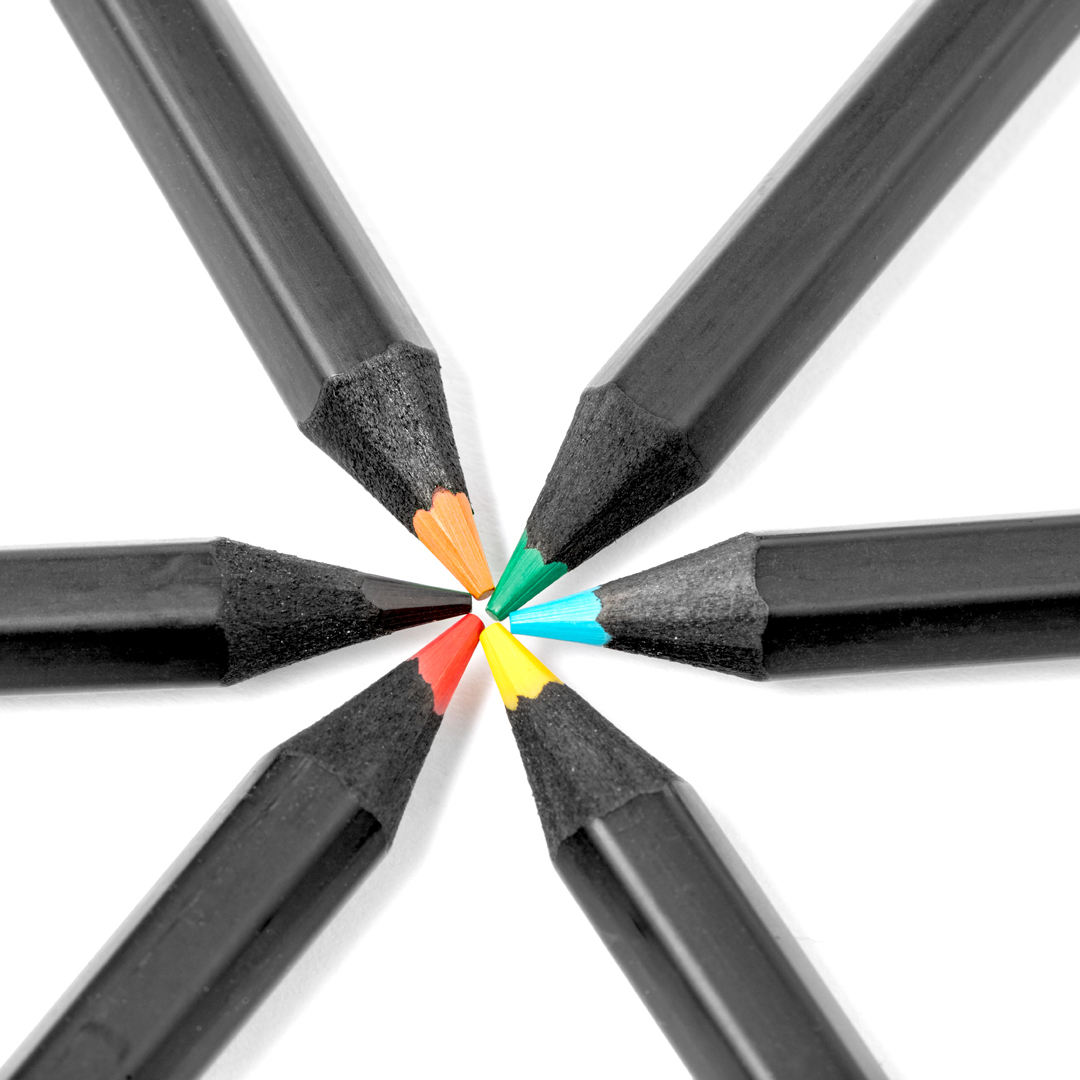 Set mit 6 Holzstiften in schwarzer Farbe, mit sechseckigem Schaft und Minen in verschiedenen Farben. Präsentiert in einer schwarzen Schachtel aus recyceltem Karton mit Klappverschluss.