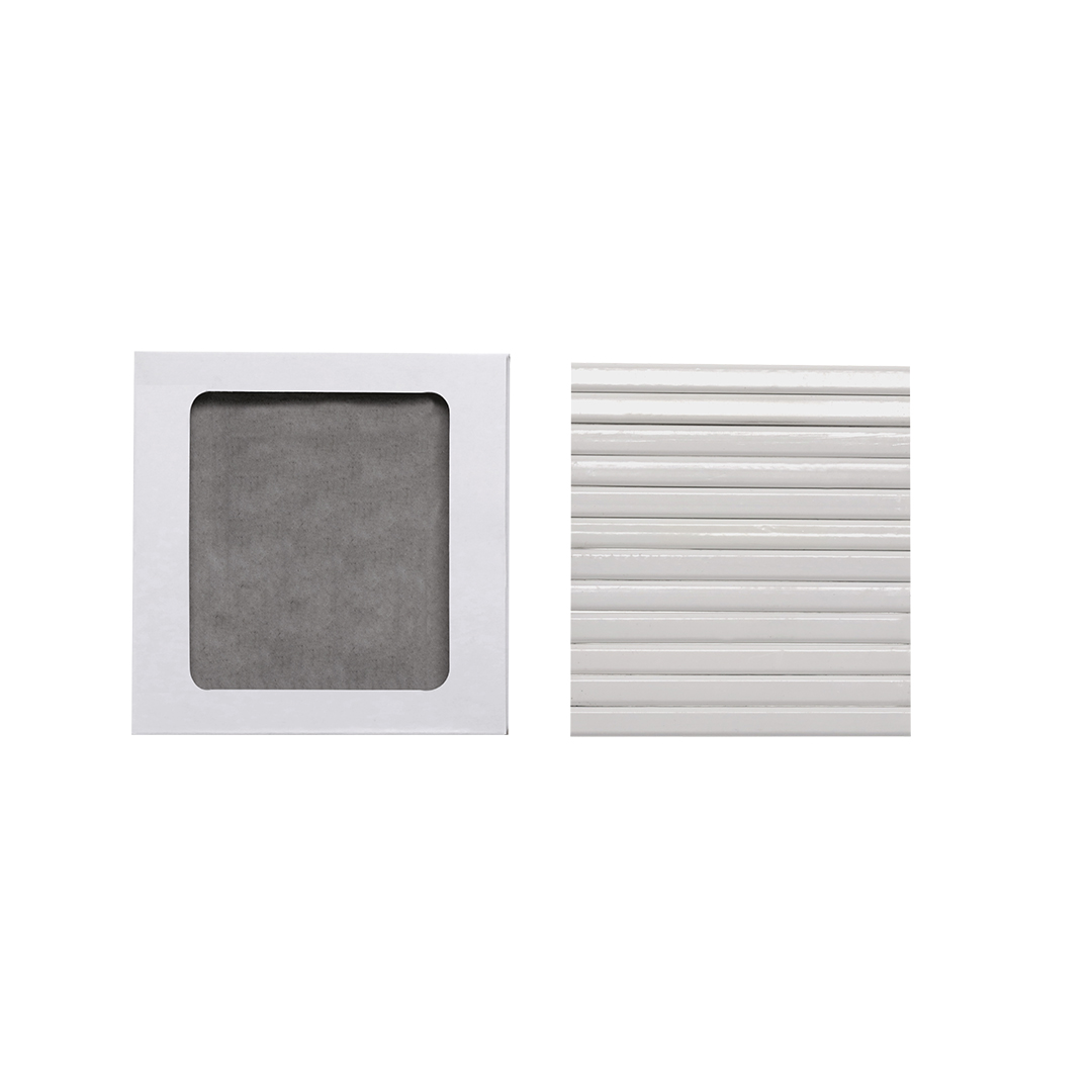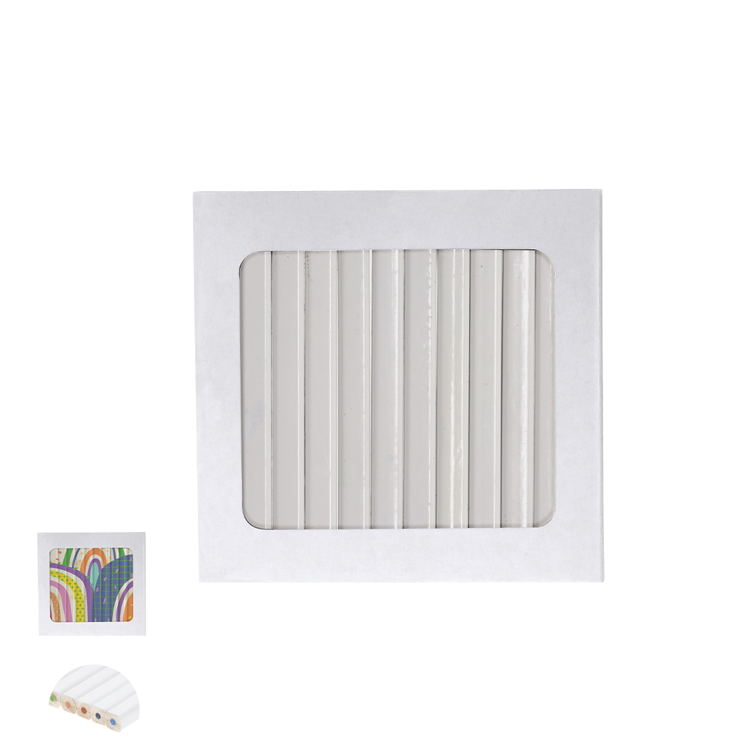 Schachteln mit 12 weißen Holzstiften, mit sechseckigem Korpus und Stiften in verschiedenen Farben. Präsentiert in einem Pappetui mit Klappenverschluss. Speziell für digitale Gravur entwickelt.