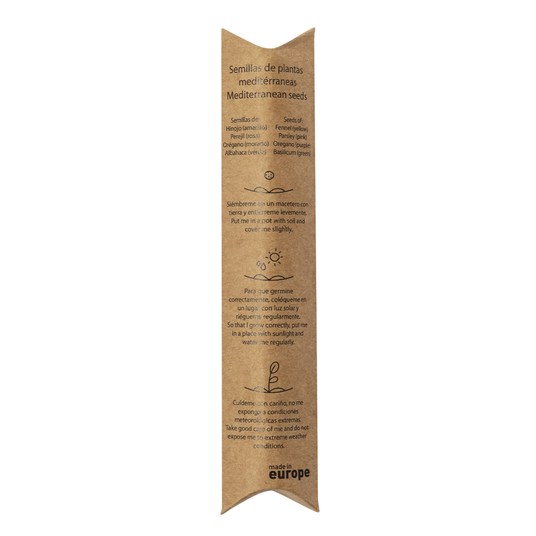 Schokoladenset mit Samen, präsentiert in einem Glasbehälter mit Korkverschluss. Dieses Set für den Gemüsegarten enthält Samen für Basilikum, Fenchel, Petersilie und Oregano. Präsentiert und geschützt in einem Umschlag aus recyceltem Karton mit Pflanzanleitung.