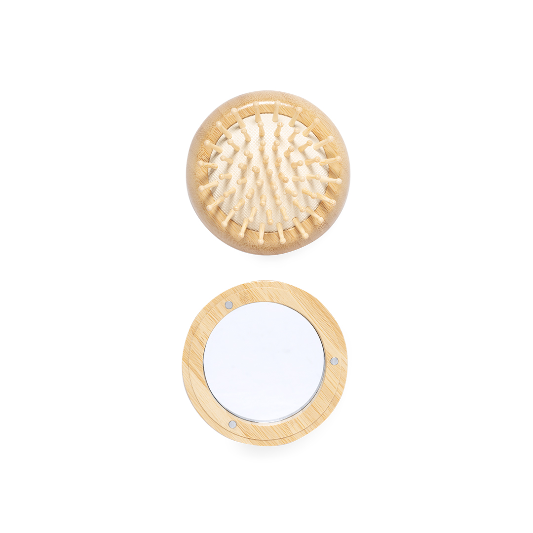 Originelle Bürste mit Spiegel aus natürlichem Bambusholz. Die magnetische Befestigung und die kompakte Größe machen ihn zu einem perfekten Accessoire für jeden Tag. Präsentiert in einer individuellen Kraft-Design-Box.