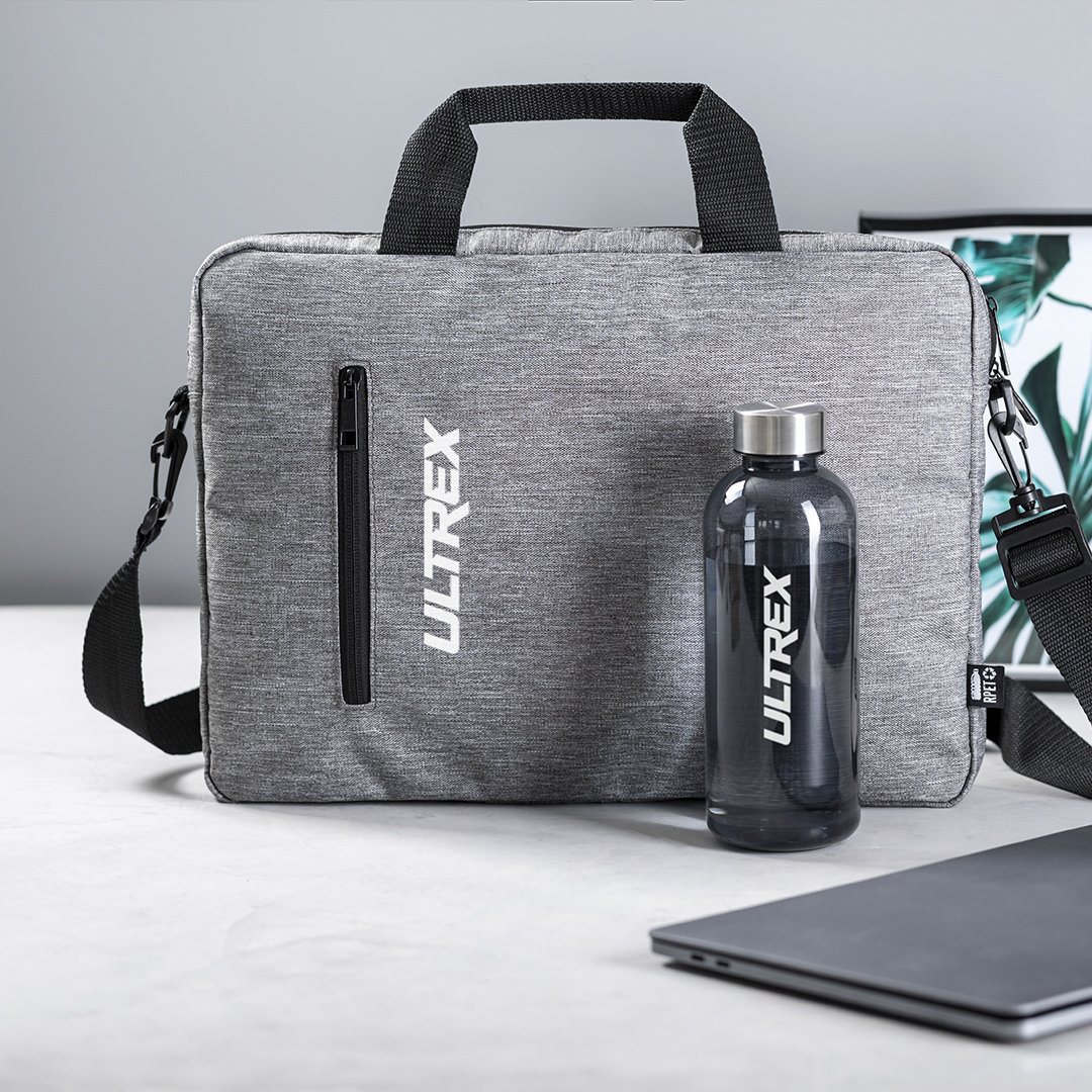 Eleganter Dokumentenhalter mit Nature Line in widerstandsfähigem 600D RPET Melange-Effekt, hergestellt aus recyceltem Kunststoff, um die Wiederverwendung von Kunststoffabfällen zu fördern und zur Nachhaltigkeit des Planeten beizutragen. Details in Schwarz, mit gepolsterten Innenfächern für Computer bis zu 15 Zoll und Tablet bis zu 10 Zoll. Trolleybefestigung auf der Rückseite, Außentasche mit Reißverschluss, komfortable verstärkte Griffe, verstellbarer Schultergurt mit Karabinerverschluss und passendem Schulterpolster. RPET-Plakette auf dem Außenetikett.
