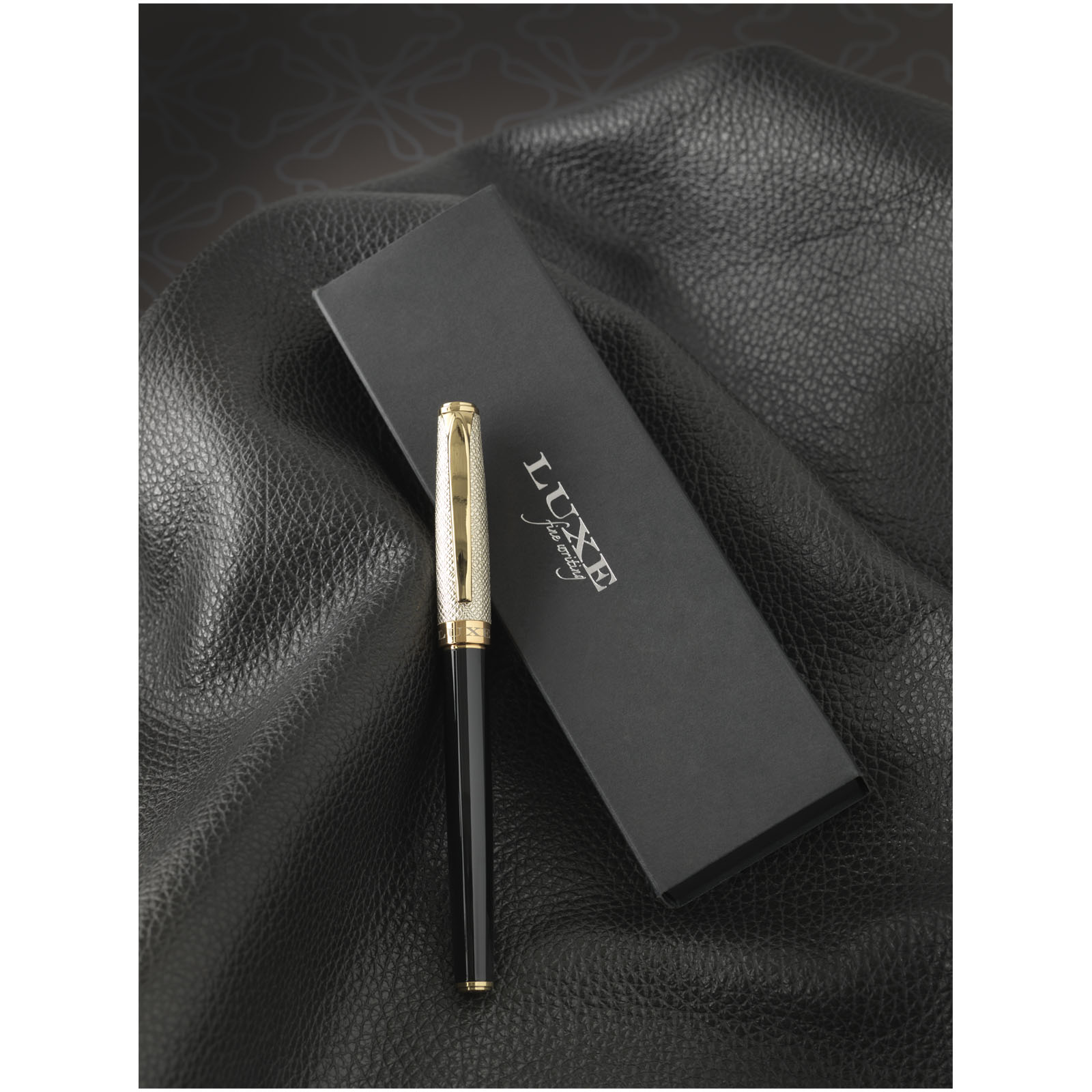 Ein luxuriöser Tintenroller mit goldener Lederkappe und lackierten goldenen Teilen, geliefert in einer Luxe-Geschenkbox. Der untere Schaft besteht aus Messing mit Lack und der obere Schaft ist aus Messing und PU-Kunststoff gefertigt. Tintenroller: 14 x 1,15 cm, Gewicht: 32 g, Schreiblänge: 500 m.