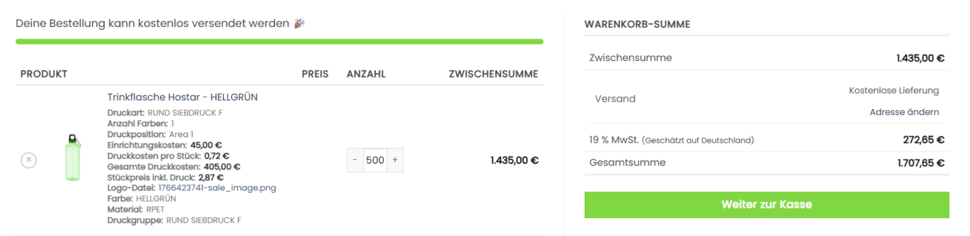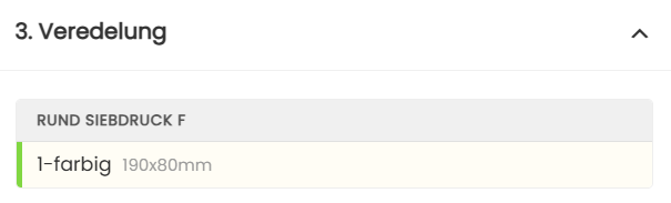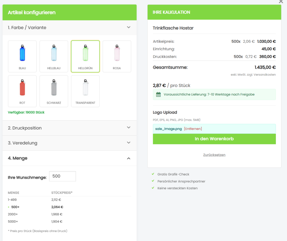 • Alle Parameter (Farbe, Position, Veredelung, Menge, Logo) werden gespeichert