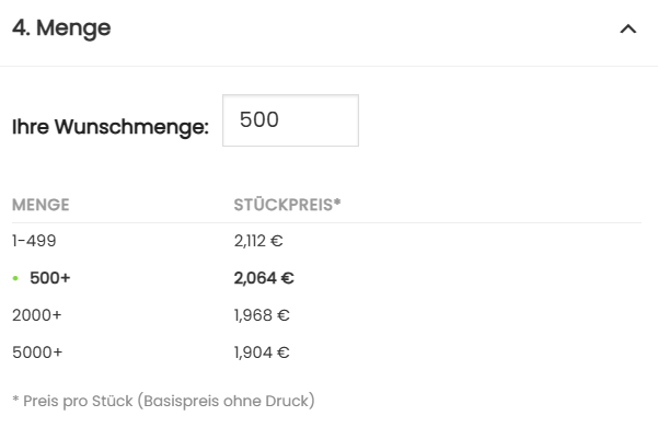 • Freie Mengeneingabe (z. B. 1, 500, 2.000 Stück)
