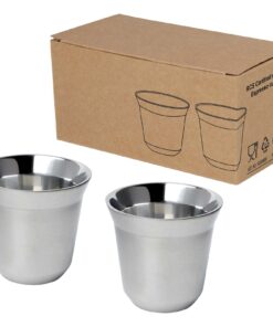 Set bestehend aus 2 doppelwandigen Espressotassen aus RCS-zertifiziertem Edelstahl. Das Fassungsvermögen beträgt 80 ml. Verpackt in einer Geschenkbox aus recyceltem Karton.