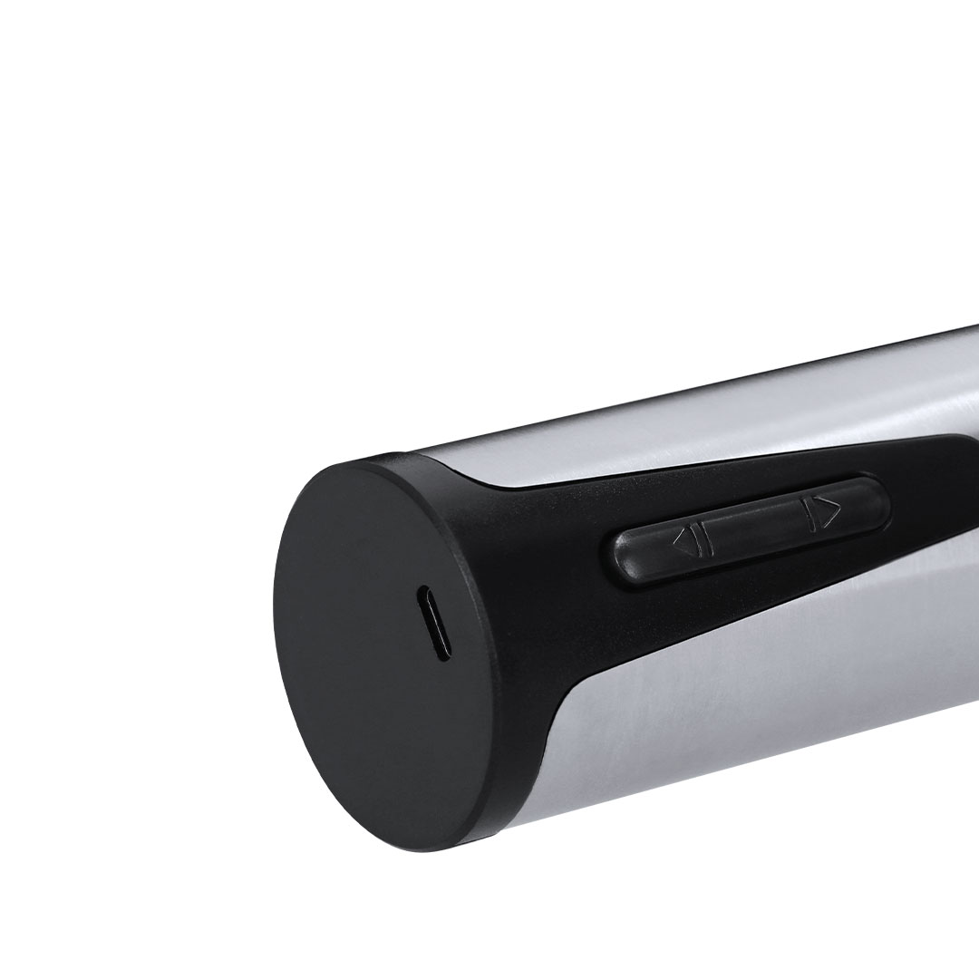 Elektrischer Korkenzieher aus Edelstahl und ABS. Er verfügt über einen Auspuffindikator und einen Korkenauswurf. Mit Lichtanzeigen während des Ladens und der Nutzung. 500 mAh wiederaufladbarer Akku, inklusive Typ-C-Ladekabel. Ein einfach zu bedienendes und funktionales Gerät.