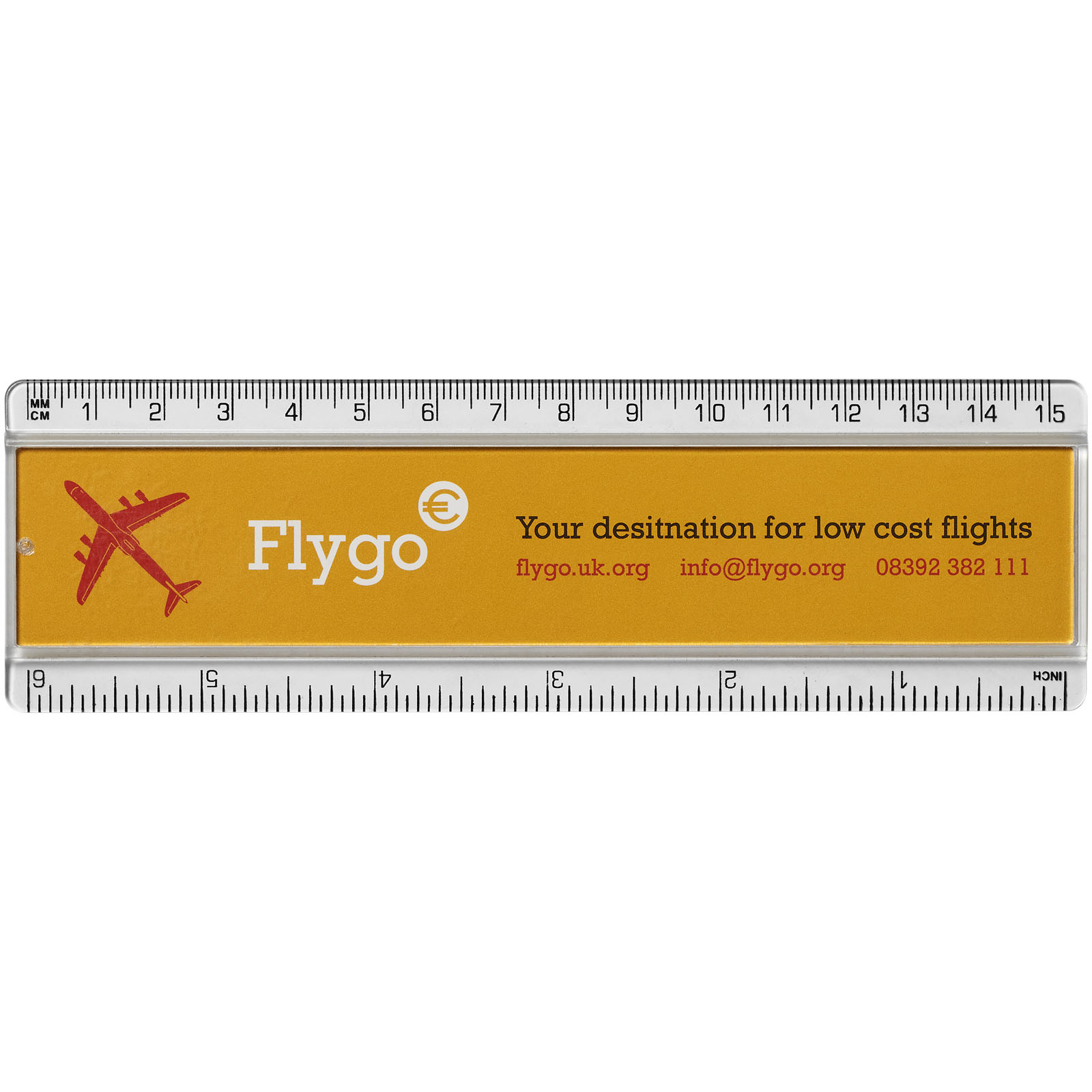 Kunststoff Lineal mit Papiereinsatz und Markierungen in Zoll und Zentimeter.