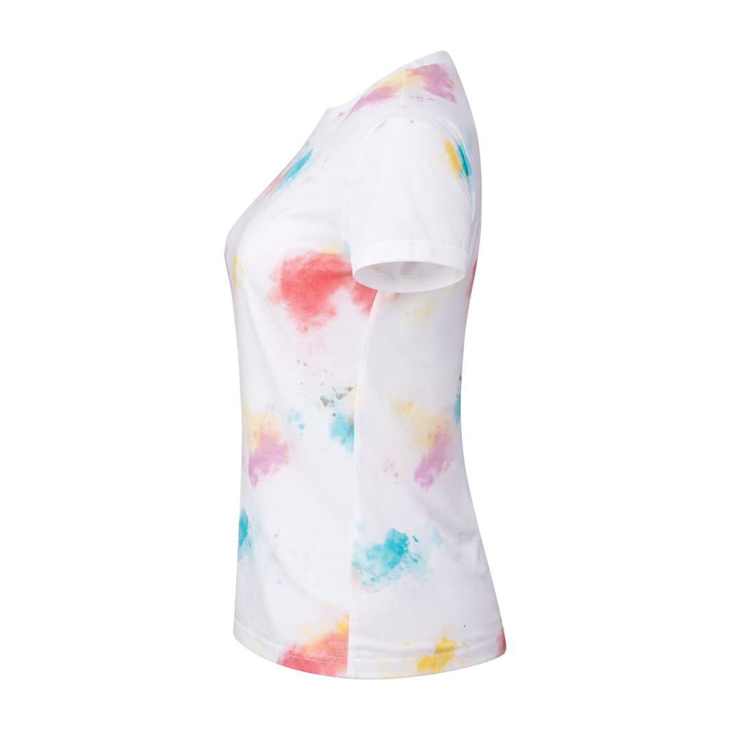 Damen T-Shirt aus 100% Polyester atmungsaktives Material 160g/m2, mit Baumwoll-Gefühl. Rundhalsausschnitt und kräftiges Druckdesign inspiriert von einer Palette von Farben. Erhältlich in den Größen S, M, L, XL.