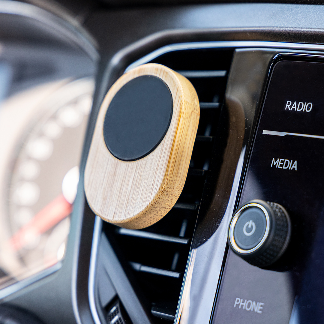 Lüftungshalterung für Smartphones aus Bambus. Bequeme und sichere magnetische Befestigung. Inklusive Klebering. Präsentiert in einer individuellen Ökodesign-Box aus Kraftkarton.Materialien wie Bambus fördern die Verwendung von natürlichen Rohstoffen und reduzieren die Schadstoffemissionen. Es handelt sich um eine sehr widerstandsfähige Pflanze, die sich durch ein vielseitiges Wachstum und eine schnelle Regeneration auszeichnet und eine hervorragende Alternative zur Verwendung von herkömmlichem Holz darstellt.