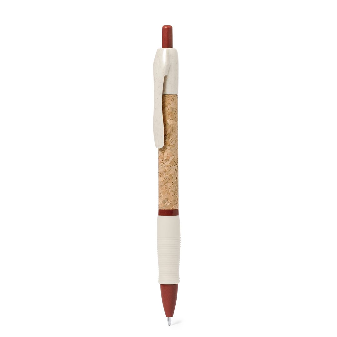 Kugelschreiber mit Druckknopfmechanik und Naturkorkschaft. Clip, Spitze und Druckknopf aus Weizenrohr. Erhältlich in einer Reihe von Farben. Abzeichen aus Weizenstroh auf der Oberseite des Stiftes. Mit blauer Tinte.Hergestellt aus pflanzlichen Bestandteilen, um die Verwendung natürlicher Rohstoffe zu fördern und Schadstoffemissionen zu reduzieren.