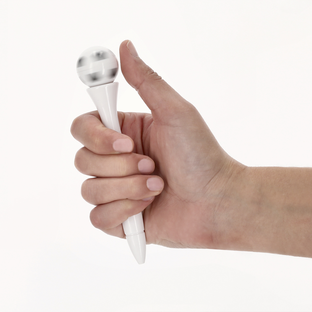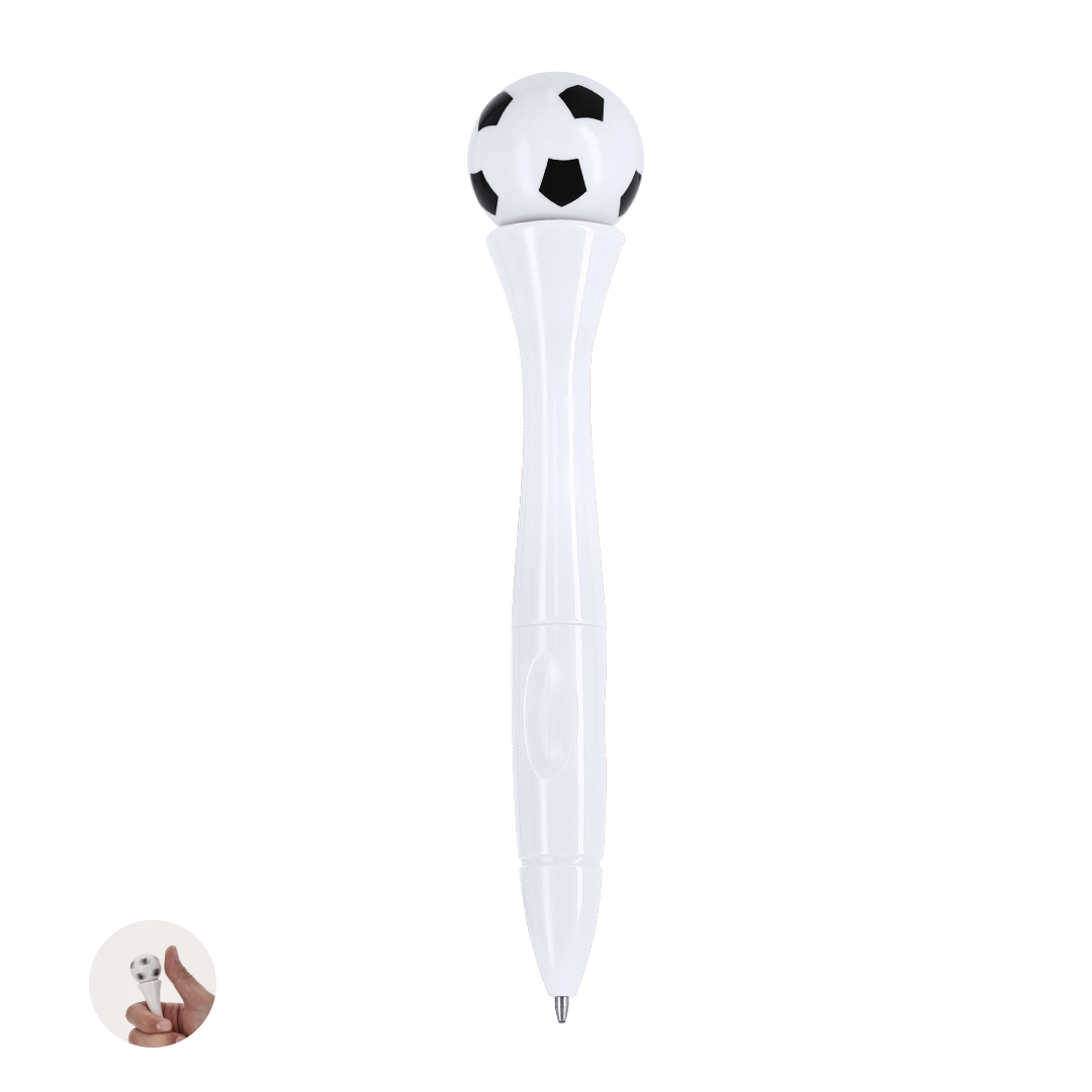 Antistressstift mit Drehmechanismus und Fußballdesign. Korpus in glänzender, einfarbiger Lackierung. Mit blauer Tinte.