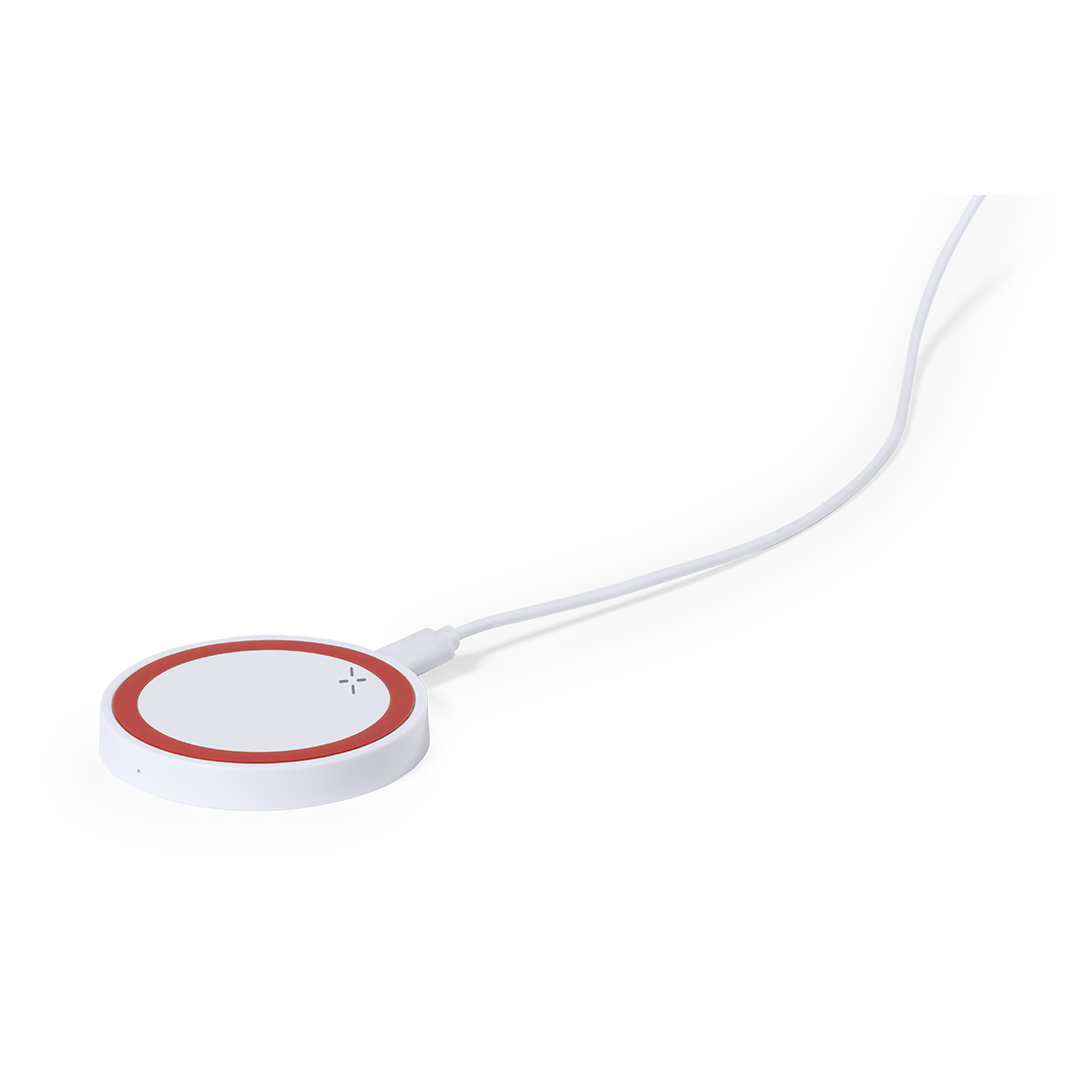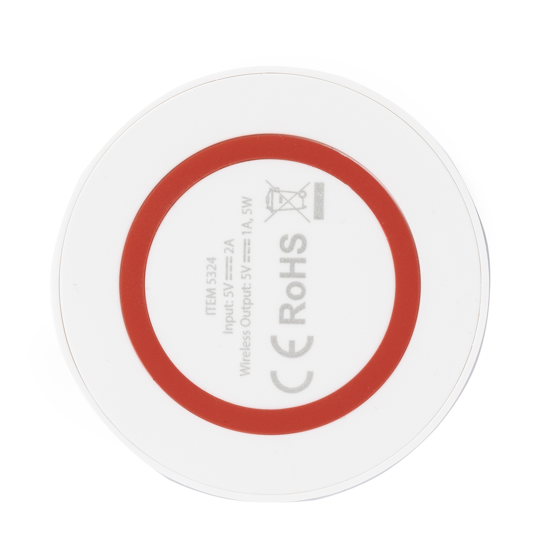 Zweifarbiges rundes kabelloses Ladegerät. Mit rutschfester Unterseite und LED-Anzeige für den Ladestatus. Kompatibel mit Smartphones mit kabelloser Ladetechnologie und präsentiert in einer attraktiven Designbox.
