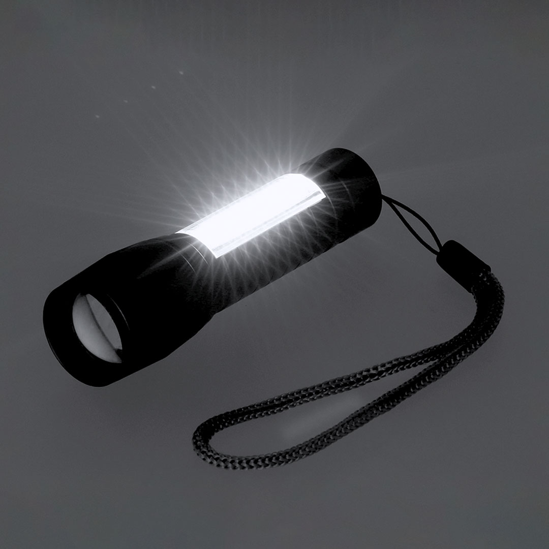 Leistungsstarke Taschenlampe mit wiederaufladbarem Akku, gefertigt aus mattem Aluminium. Frontlicht mit 8 LEDs und verstellbarem Zoom. Zusätzlich verfügt sie über 10 COB-Lichter am Griff und drei Beleuchtungsmodi (fest und blinkend und seitlich), einschließlich eines Transportbands. Er wird von einem 400-mAh-Akku betrieben, einschließlich eines Typ-C-Kabels.