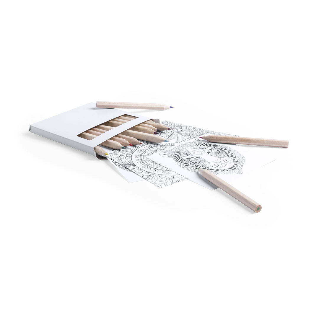 Set aus Buntstiften und Ausmalbildern mit Mandala-Designs – perfekt zum Entspannen. Enthält 12 sechseckige Buntstifte und 12 Ausmalbilder mit verschiedenen Designs. Präsentiert in einer Kartonschachtel mit Fenster.