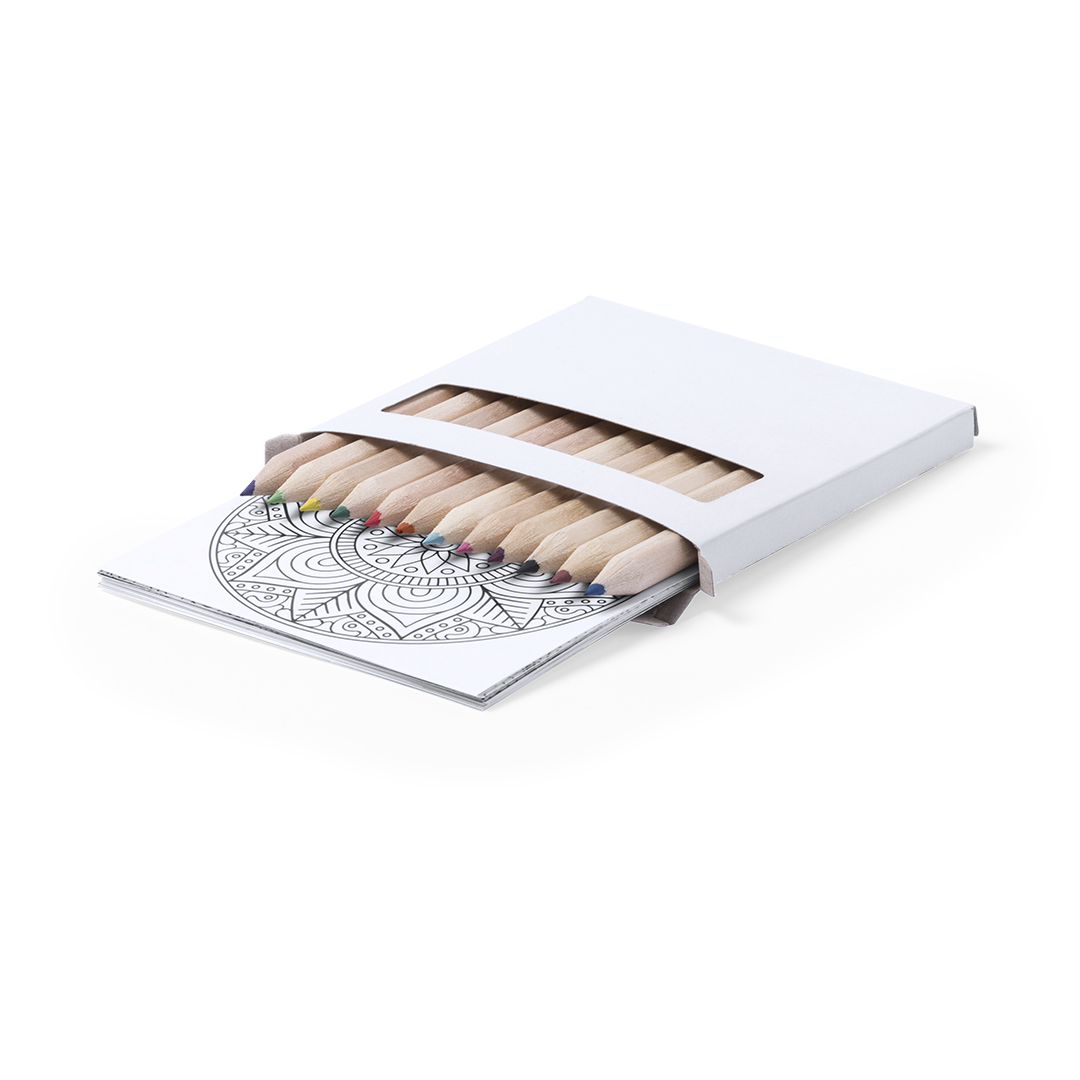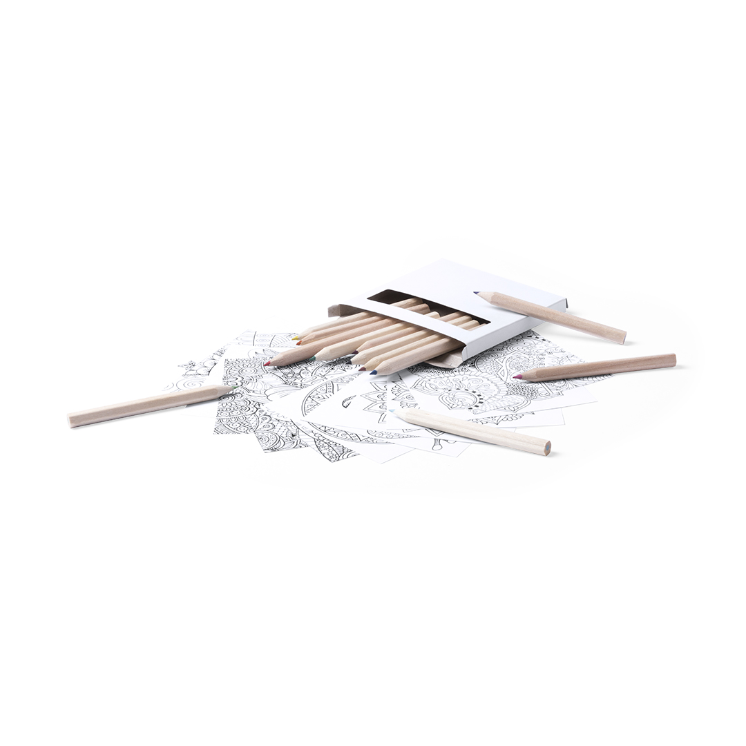 Set aus Buntstiften und Ausmalbildern mit Mandala-Designs – perfekt zum Entspannen. Enthält 12 sechseckige Buntstifte und 12 Ausmalbilder mit verschiedenen Designs. Präsentiert in einer Kartonschachtel mit Fenster.