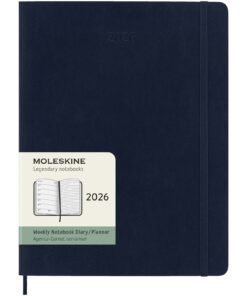 Der von Januar bis Dezember 2026 datierte Moleskine XL Softcover Wochenplaner für 12 Monate zeigt die ganze Woche auf einen Blick, bietet aber auch Jahres- und Monatsübersichtsseiten für einen breiteren Jahresüberblick, gefolgt von Seiten für Reiseplanung, Ideen und Ziele. Auf der einen Seite sind die Wochentage dargestellt, gegenüber befindet sich eine linierte Seite, auf der Aufgaben und Notizen eingetragen werden können. Er enthält elfenbeinfarbenes, säurefreies Papier, einen schwarzen, elastischen Verschluss, ein Seitenband, eine farblich abgestimmte, erweiterbare Innentasche und Aufkleber zur persönlichen Gestaltung sowie Jahresaufkleber für den Buchrücken.