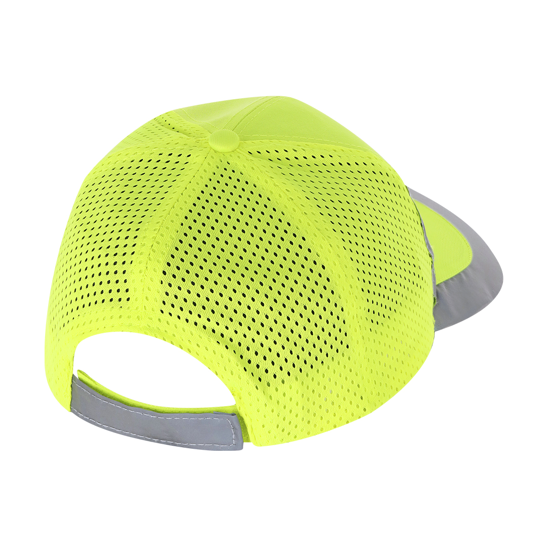 Sportmütze aus weichem Polyester. Verstellbarer Klettverschluss und atmungsaktiver Netzrücken. In fluoreszierendem Gelb mit reflektierenden Details an Schirm, Front und Verschluss.