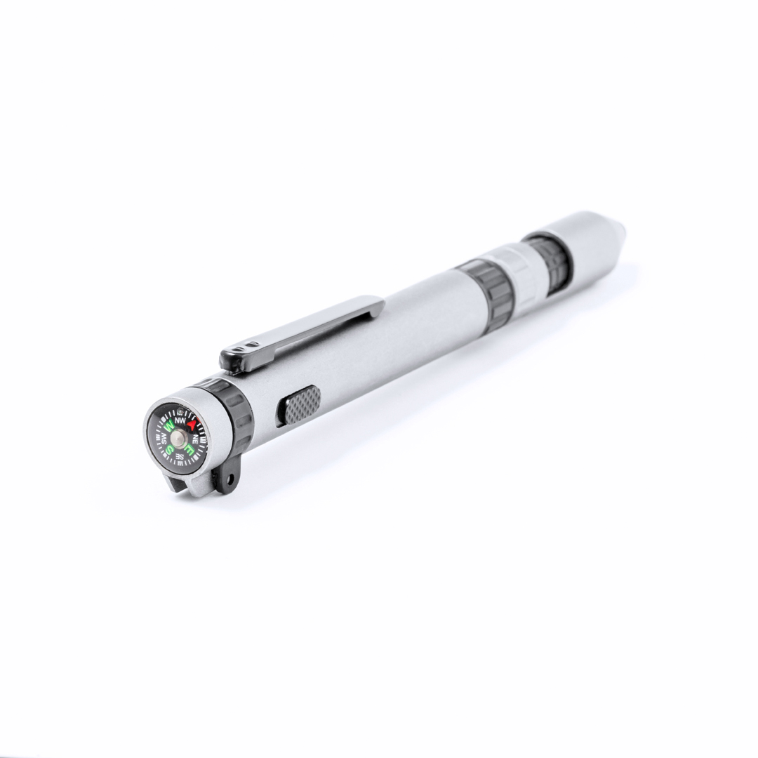 Handlicher Multifunktionsstift mit 7 Verwendungsmöglichkeiten. Lieferumfang: Handyhalter, Stylus, blauer Tintenstift, Taschenlampe mit Knopfzellenbatterie (im Lieferumfang enthalten), Kompass, Flach- und Kreuzschlitzschraubendreher. Einzeln präsentiert in einer Kraft-Design-Box.