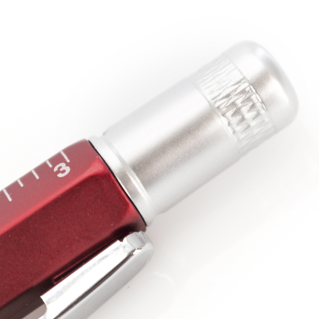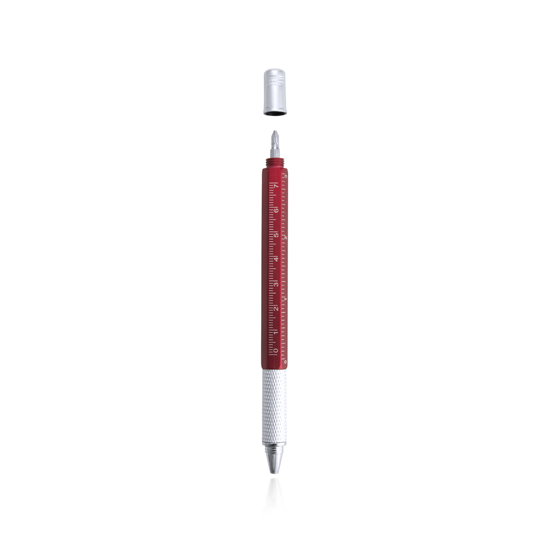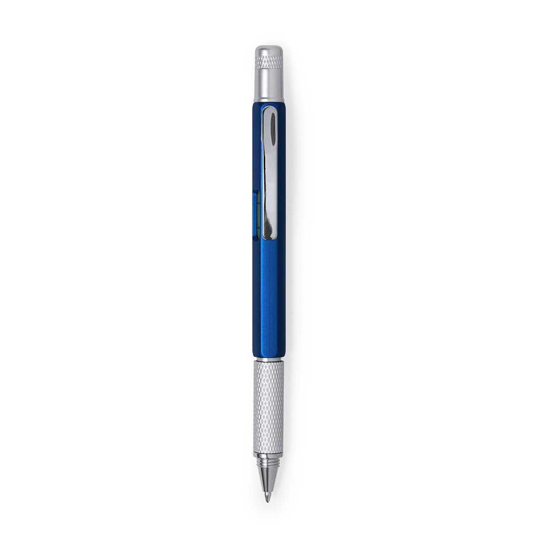 4-in-1 Multifunktions-Dreh-Kugelschreiber in verschiedenen Farben. Mit weichem Griff und integrierter Wasserwaage sowie Lineal mit Skala in Zentimetern und Zoll und Doppelkopf-Schraubendreher – schlitz- und kreuzförmig. Mit Metallclip und blauer Tinte.