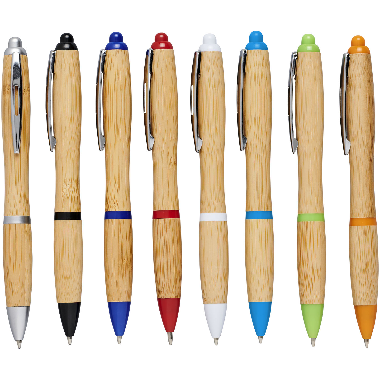 Kugelschreiber mit Klickmechanismus, mit einem Schaft aus Bambus, akzentuiert durch einen verchromten Clip und Verzierungen aus ABS-Kunststoff. Die Farbe des Bambusmaterials kann variieren.