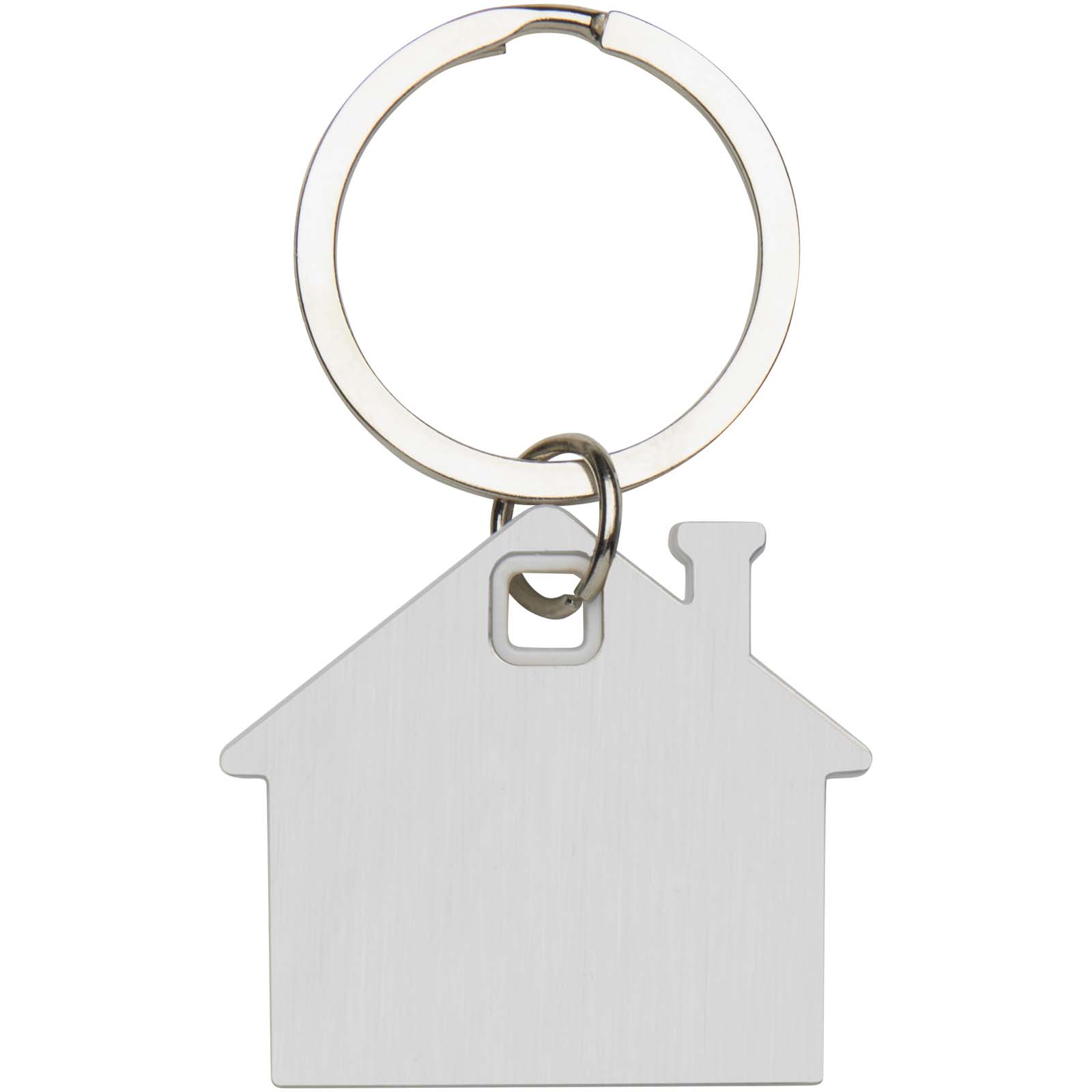 Schlüsselanhänger in Form eines Hauses mit einer Edelstahlplatte mit mattem Design auf der Vorder- und Rückseite und einem farbigen Kunststoffchip in der Mitte.