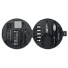 25-teiliges Werkzeug-Set in Form eines Autoreifens. Beinhaltet 1 Verlängerung, 1 Schraubenzieher, 1 Zange, 5 Fassungen, 3 Sechskantschlüssel, 10 Stück Bit-Satz, 2 Präzisionsschraubenzieher und 1 Maßband.