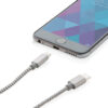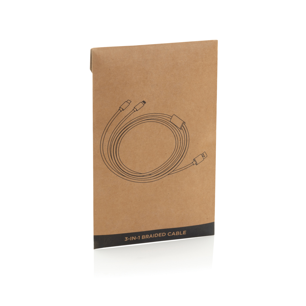 Mit Nylon-Material umwobenes 3-in-1 Ladekabel mit Type-C USB und zweiseitigem Anschlußstecker für iOS und Android Geräte, die einen Micro-USB Anschluß benötigen. 120 cm lang.