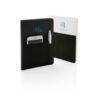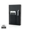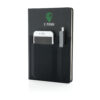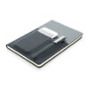 A5 Notizbuch mit 160 cremefarbenen Seiten, liniert, 80g/m². Auf dem FrontCover ein Fach für Ihr Smartphone sowie einen Stift und einem größeren Fach für Dokumente. Smartphone für Geräte bis zu 8cm Breite ( wie z.B. iPhone 7 plus).