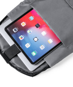Rucksack aus hochwertigem, strapazierfähigem 600D-Polyester. Mit Anti-Diebstahl-Tasche auf der Rückseite zur Aufbewahrung von Wertsachen. Innenfach mit USB-Anschluss für den Anschluss einer Powerbank (nicht enthalten) und Außentasche mit unsichtbarem Reißverschluss. Polsterung an Griff, Rücken und Schultergurten, letztere verstellbar. Innen mit gepolsterten Fächern für Laptops bis zu 15″ und Tablets bis zu 10″. Befestigung auf der Rückseite für die Montage eines Trolleys.