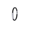 Schwarzes Kunstlederarmband mit einer Plakette aus poliertem Edelstahl in flachem Design. Verfügt über einen originellen magnetischen Sicherheitsverschluss.