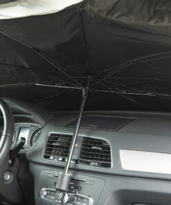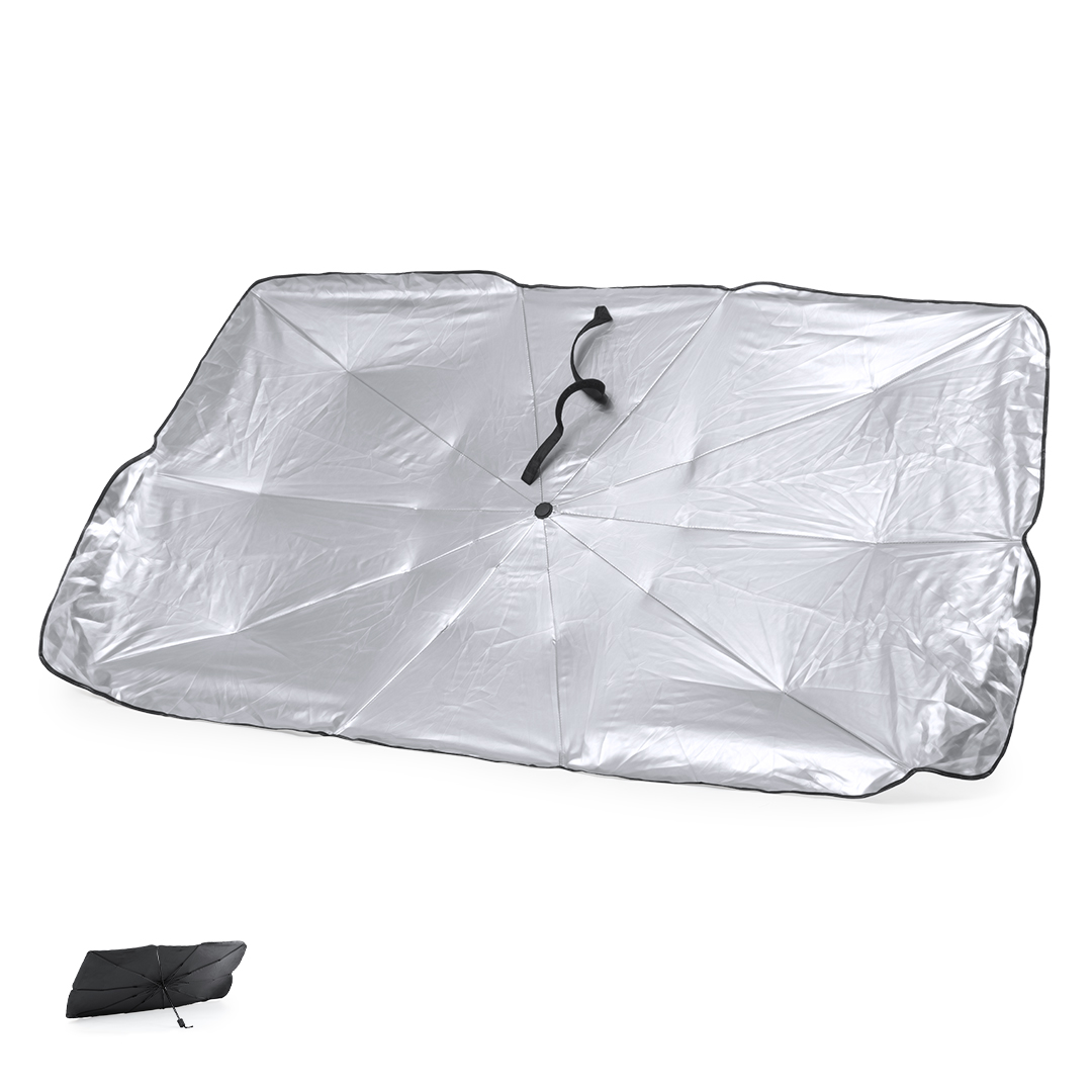 Faltbare Auto-Sonnenschutz. Größe 140x78cm. Mit manuellem Öffnungsmechanismus und Polyesterhülle im Lieferumfang.