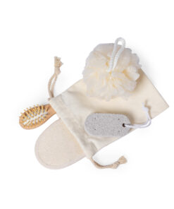 Komplettes Badeset mit 4 Accessoires, präsentiert in einer praktischen, selbstschließenden Baumwolltasche. Im Lieferumfang enthalten: Haarbürste aus weichem Holz mit passenden Borsten, weicher Schwamm, an die Handfläche anpassbarer Peelingschwamm und ein Bimsstein.