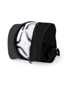Praktische Balltasche aus RPET. Sie verfügt über ein zentrales Fach, in dem Sie einen Ball mit Hilfe eines Reißverschlusses verstauen können, und ist sowohl mit der Hand als auch mit dem Schultergurt leicht zu tragen. Außerdem hat sie zwei seitliche Netztaschen. Mit RPET-Logo auf dem Etikett.Das RPET-Material wird aus recyceltem Kunststoff hergestellt, um die Wiederverwendung von Kunststoffabfällen zu fördern und einen Beitrag zur Nachhaltigkeit unseres Planeten zu leisten.