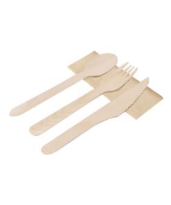 Set von 4-in-1 ökologischen Bestecken aus natürlichem Holz mit Serviette. Enthält: Löffel, Gabel, Messer und Kraftpapierserviette. Präsentiert in einer einzelnen Tasche.Hergestellt aus pflanzlichen Elementen zur Förderung der Verwendung von natürlichen Rohstoffen und zur Reduzierung der schädlichen Emissionen.