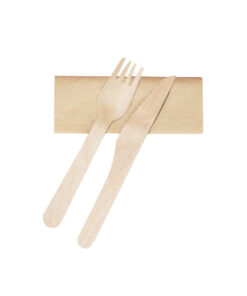 Set von 3-in-1 ökologischen Bestecken aus natürlichem Holz mit Serviette. Enthält: Gabel, Messer und Kraftpapierserviette. Präsentiert in einer einzelnen Tasche.Hergestellt aus pflanzlichen Elementen zur Förderung der Verwendung von natürlichen Rohstoffen und zur Reduzierung der schädlichen Emissionen.