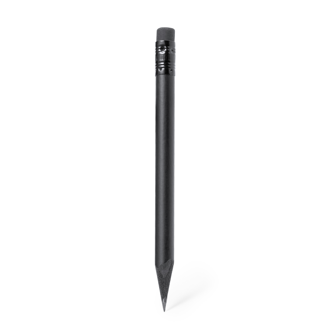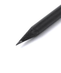 Bleistift aus Naturholz mit mattschwarzer Oberfläche, mit schwarzer Mine, angespitzter Spitze und passendem Radiergummi oben drauf.