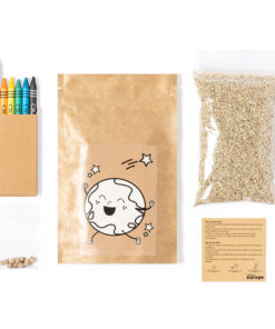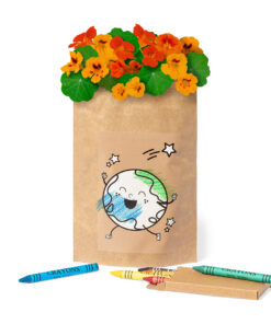Topf mit Kapuzinerkresse-Samen der Linie Natur. Präsentiert in einem Umschlag aus recyceltem Papier, Design. Inklusive 6 Buntstifte zum Ausmalen in einer Schachtel aus recyceltem Karton. Ein ökologisches Gadget, das die Sorge um die Umwelt mit dem Spaß am Malen verbindet.