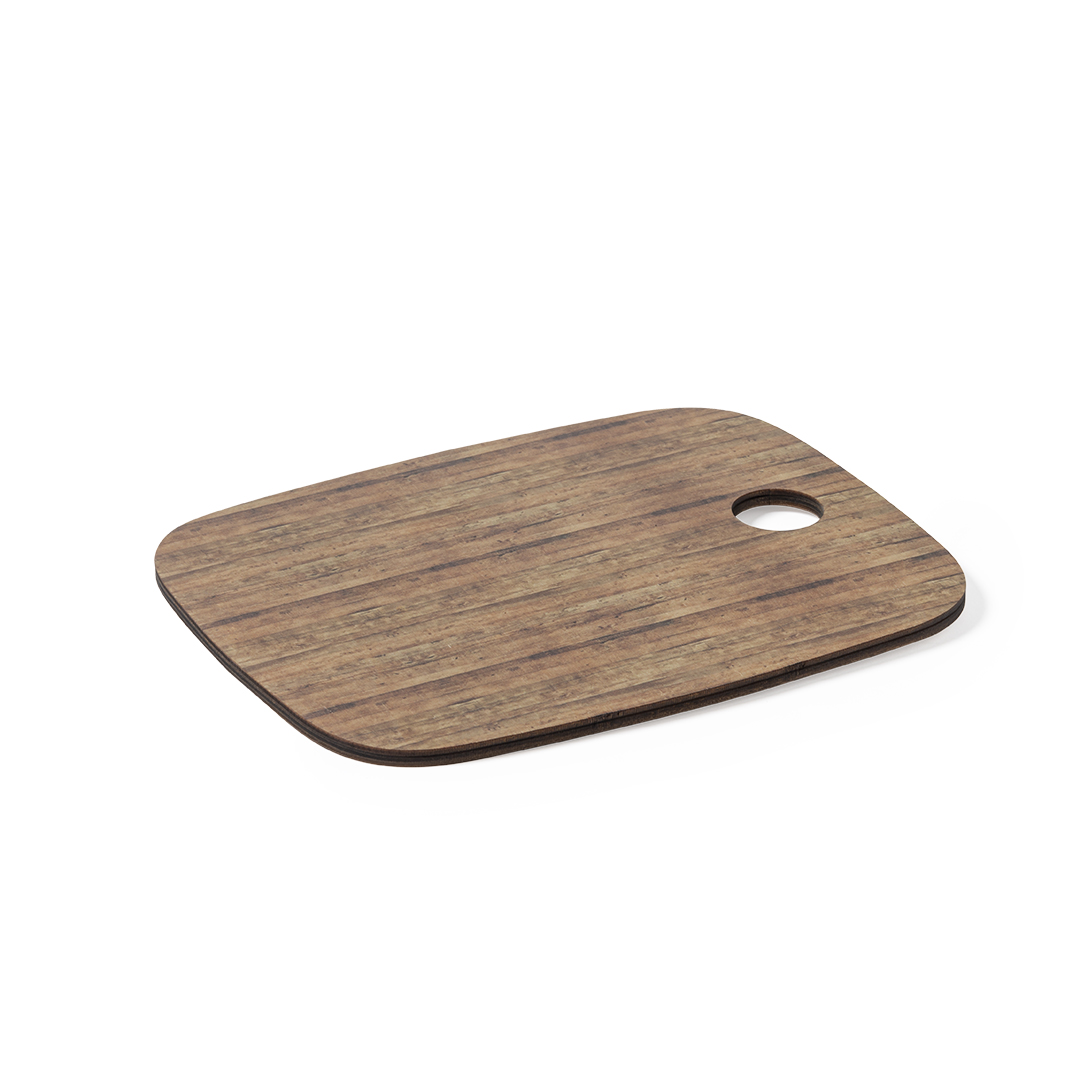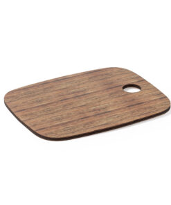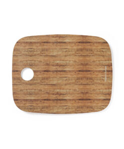 Schneide- und Servierbrett aus Naturholz, mit Loch zum Aufhängen. Große Brandingfläche und Made in Europe-Logo.