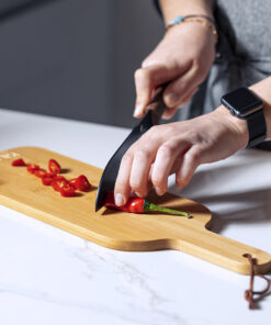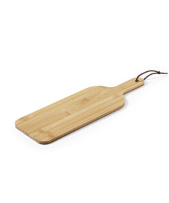 Brett aus Bambus, mit einer glatten und widerstandsfähigen polierten Oberfläche. Ideal zum Schneiden und Präsentieren. Mit Griff zur einfachen Handhabung und Aufhängekordel aus Kunstleder.