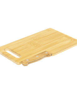 Küchenbrett aus Bambus und Sägemesser. Es verfügt über einen gestanzten Griff zur einfachen Handhabung und ein Fach zur Aufbewahrung des Messers auf dem Brett. Messer mit Bambusgriff und Klinge aus rostfreiem Stahl. Präsentiert in einer Kraft-Design-Box.