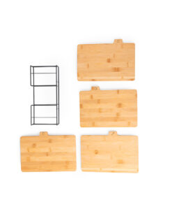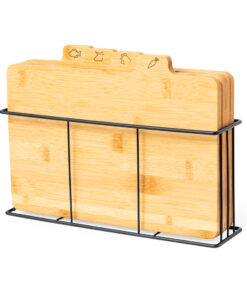 Satz Schneidebretter aus Bambus, jedes einzelne ist leicht an den Schnittmustern zu erkennen, speziell für Fisch, weißes Fleisch, rotes Fleisch und Gemüse geschnitzt. Inklusive Metallkorb mit Führungen zur ordentlichen Aufbewahrung. Präsentiert in einer Kraft-Design-Box. Materialien wie Bambus fördern die Verwendung natürlicher Rohstoffe und reduzieren so den Schadstoffausstoß.