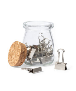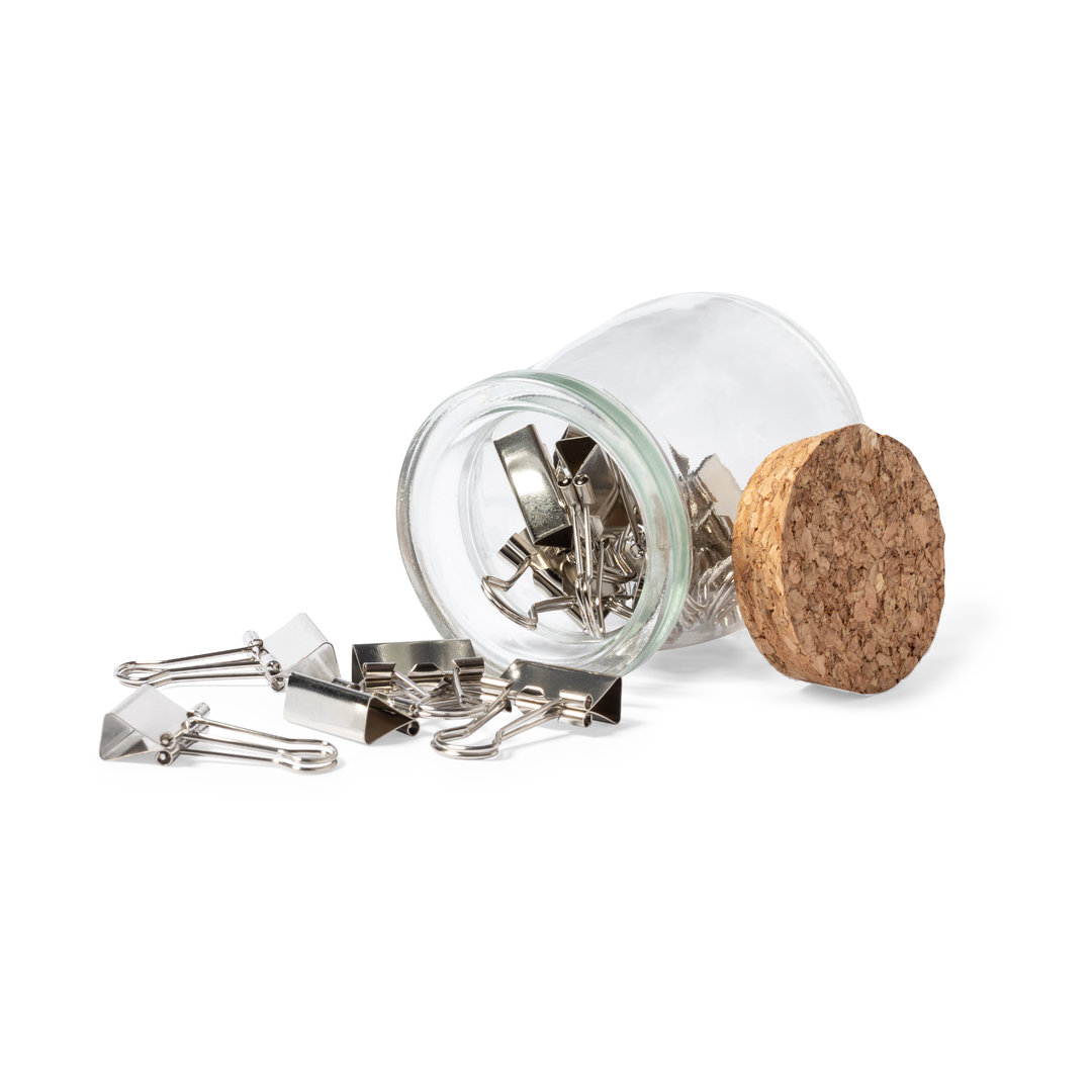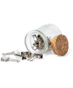 Cliphalter aus widerstandsfähigem, transparentem Glas, mit originellem Vintage-Design und Naturkorkverschluss. Inklusive 15 Metallklammern, präsentiert in einer individuellen Kraftkartonschachtel.