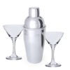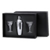 Elegantes Cocktail-Set. Inklusive einem Edelstahl-Cocktail-Shaker mit 550ml Fassungsvermögen, um die besten Cocktail-Mischungen zuzubereiten. Darüber hinaus enthält es 2 Glaser mit je 150 ml, mit einem eleganten dreieckigen Design, für eine exquisite Präsentation. Präsentiert in einer schwarzen Box.