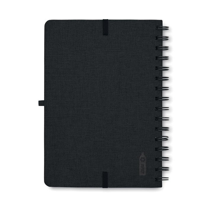 DIN A5 Notizbuch mit Hard Cover aus 600D RPET. Inkl. Smartphone-Halter. Spiralbindung. 80 Blatt (160 Seiten) liniertes Recyclingpapier 70g/m². Elastisches Verschlussband.