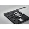 DIN A4 Portfolio mit Cover aus PU in Leinen-Optik. Magnetverschluss. Block mit 20 Blatt (40 Seiten) liniertem Papier. Inkl. 4000 mAh Powerbank und Mikro-USB-Kabel/Typ C. Smartphone- /Tablet Halterung. Kreditkarten Steckfächer. Stiftschlaufe. Mit schwarzer Aluminium Plakette für Ihr Logo.