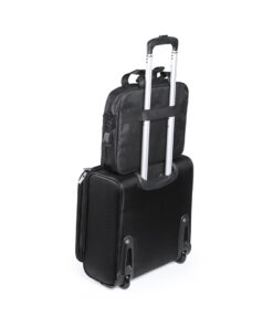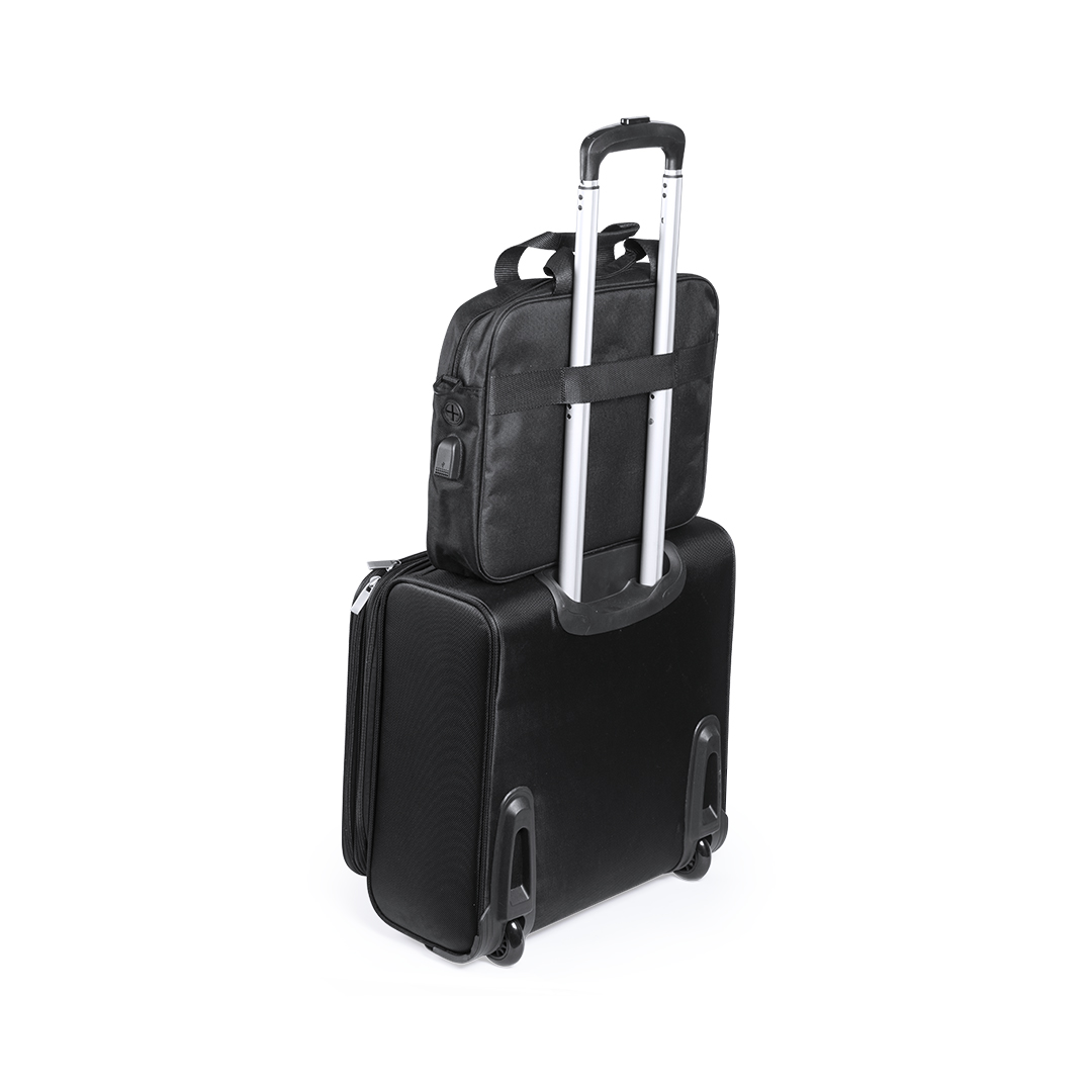 Dokumententasche aus resistentem 600D Polyester in Schwarz. Mit Reißverschluss, Kopfhörerausgang und Fach mit USB-Ausgang für externen Akku (nicht inklusive) im Inneren sowie robusten verstärkten Griffen. Zudem mit Befestigungsgurt auf der Rückseite für Anbringung an einem Trolley, gepolstertem Fach für Laptop von bis zu 15 Zoll und Tablet von bis zu 10 Zoll. Mit vielen verschiedenen Innen- und Außentaschen sowie verstellbarem Schultergurt mit Karabinerbefestigung.