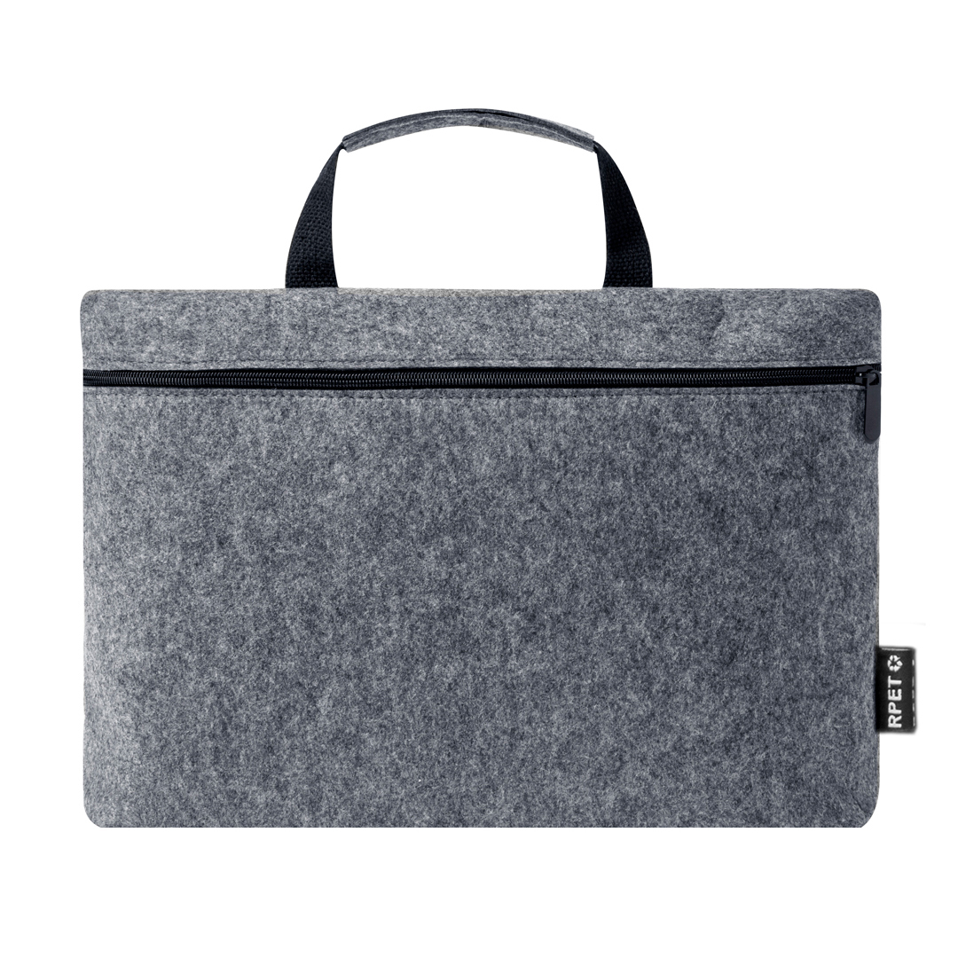 Dokumententasche aus strapazierfähigem RPET-Filz mit Melange-Effekt. Hauptfach mit Reißverschluss für Laptops bis zu 15″ und kleines Innenfach. Mit passenden robusten Griffen mit schwarzen Details. RPET-Emblem auf dem Außenetikett.RPET-Filz ist das Ergebnis der Kombination des Recyclingprozesses von Kunststoffen mit der jahrtausendealten Technik der Filzherstellung. Das Ergebnis ist ein Öko-Trend-Material, das nicht nur aus recyceltem Material besteht, sondern auch wiederverwertbar ist.