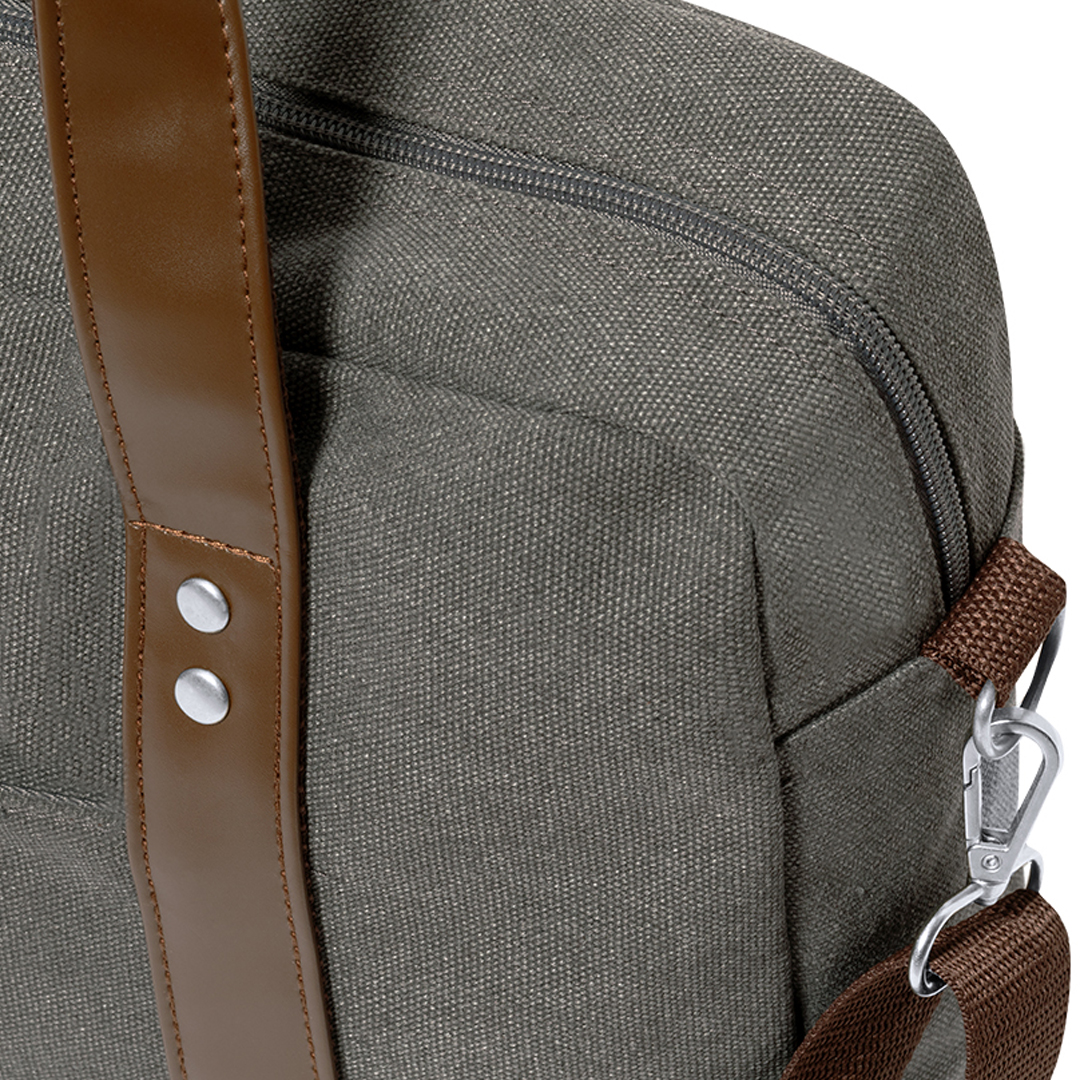 Zeitlos gestaltete Umhängetasche aus strapazierfähigem 475 g/m2 Canvas, grau, mit Kunstlederriemen und praktischem, verstellbarem Schultergurt. Gepolsterter Innenraum mit Laptop-Fach bis zu 15″. Mit praktischer Tasche an der Außenseite. Präsentiert in einer individuellen Recycling-Tasche.