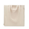 Einkaufs- oder Strandtasche aus recyceltem Polycotton (70% recycelte Baumwolle, 30% recycelter Polyester) mit kurzen und langen Griffen. Sie hat eine Seitentasche mit Reißverschluss. 380 g/m².